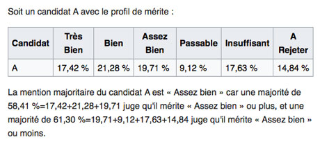 C’est la promesse du jugement majoritaire. Dans ce type de scrutin, vous ne votez pas pour un candidat, mais vous attribuez une appréciation à chaque candidat : « Très bien », « Bien », « Assez bien », « Passable », « Insuffisant », « À rejeter ». Les candidats qui arrivent en tête sont ceux qui ont obtenu la meilleure « mention-majoritaire », selon l’exemple ci-dessous.