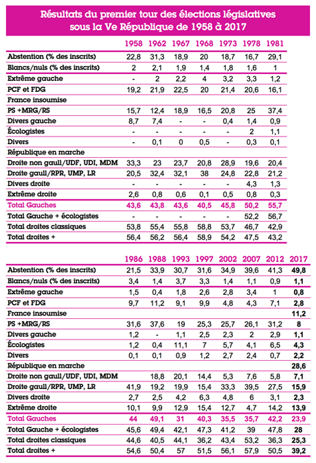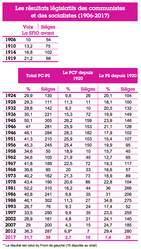 Quand se constitue le Parti socialiste unifié, au début du XXe siècle, la première consultation électorale le place à 10% des suffrages exprimés et il envoie 54 députés à la Chambre. Au premier tour des législatives de 2017, le Parti communiste et le Parti socialiste regroupent à eux deux 10,2% des suffrages et leur représentation parlementaire est de 40 députés.