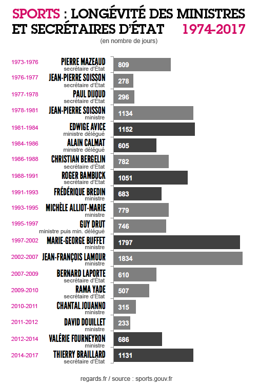 Le mandat de François Hollande aura au moins eu le mérite de ne compter que deux secrétaires d’État, quand celui de Nicolas Sarkozy avait vu se succéder Bernard Laporte, Rama Yade, Chantal Jouanno et David Douillet. On est tout de même resté loin des records de longévité détenus par Marie-George Buffet (1997-2002) et Jean-François Lamour (2002-2012).