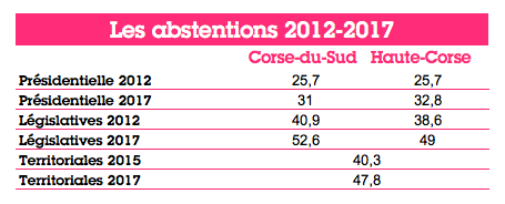 L’élection s’inscrit dans un climat de crise politique aiguë. Des années de politique clanique, entre la droite traditionnelle et une gauche pour le moins « modérée », ont émoussé le sens civique, longtemps contrôlé par des réseaux notabiliaires dépassés. Entre 2015 et 2017, l’abstention a progressé considérablement, de près de 7 points. Le niveau atteint ce dimanche se rapproche des plus forts scores atteint en juin 2017 : 47,8 % contre 52,6 % (Corse-du-Sud) et 49 % (Haute-Corse).