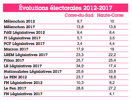 4. À gauche, le déclin du PCF n’a pas été vraiment compensé. Il est significatif que les résultats départementaux de Jean-Luc Mélenchon en 2017 aient été en Corse les plus modestes de tout le territoire métropolitain. Et à deux reprises, en 2012 et en 2017, les résultats du Front de gauche et ceux cumulés du PCF et des Insoumis sont restés en retrait à la fois des scores anciens du PC et des résultats présidentiels de Jean-Luc Mélenchon. Aux législatives de 2017, la responsabilité en incombe pour une part à un PC resté bien frileux face au leader de la France insoumise et refusant alors toute dynamique de convergence électorale.