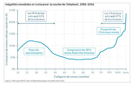 La courbe classe la population mondiale selon leurs revenus monétaires calculés en équivalent de pouvoir d’achat, du plus petit au plus grand par tranches de 1%. Les auteurs ont calculé l’augmentation de pouvoir d’achat de chaque tranche entre 1988 et 2008, c’est-à-dire pendant la phase de mondialisation intense qui l’a caractérisée. Elle a peu profité aux plus pauvres de la planète, c’est la queue de l’éléphant. Elle a bénéficié fortement à 1/5éme de la population mondiale qui se classe autour du revenu mondial médian, le haut de la tête de l’éléphant. Pour leur immense majorité ces personnes vivent dans les pays émergents d’Asie, Chine en tête, et ils se classent au milieu de la distribution des revenus dans leurs propres pays. Clairement, une nouvelle classe moyenne mondiale s’est constituée, même si ces personnes restent plus pauvres que celles formant les classes populaires et moyennes des pays riches. Celles-ci sont les grandes perdantes. Leur revenu a piétiné, c’est le bas de la tête.