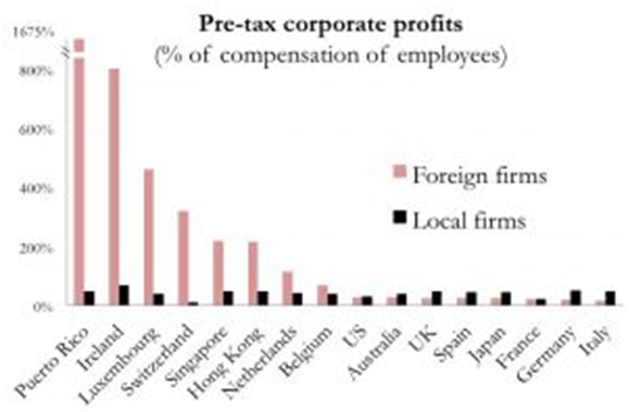 Gabriel Zucman et ses collègues ont calculé que dans les principaux pays développés les profits avant impôt des firmes représentent 30 à 40% des salaires qu’elles versent. La part tend à être plus faible pour les firmes étrangères que pour les firmes locales. Dans les paradis fiscaux la part pour les firmes nationales est dans la moyenne des autres pays. Mais pour les firmes étrangères, c’est beaucoup, beaucoup plus. Aux Pays-Bas, on est autour de 100%. Au Luxembourg au-dessus de 400% et en Irlande autour de 800%.