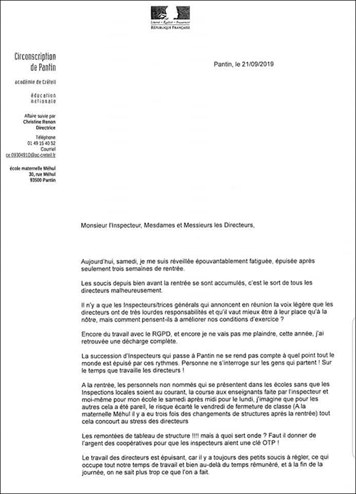 Christine était directrice d’école depuis plus de trente ans. Ce week-end, « épuisée », elle a décidé de mettre fin à ses jours. Son geste ne souffre d’aucune ambiguïté : avant de se donner la mort dans son école, elle a écrit une lettre à tous (lire ci-dessous), qu’elle a adressé personnellement à ses collègues directrices de directeurs d’école de la ville de Pantin. « C’est un geste de lanceur d’alerte », confie sa collègue Alexandra. Et d’ajouter : « On est tellement tenu de ne rien dire, coincé par le secret professionnel et le devoir de réserve. Dès qu’on s’ouvre de nos conditions de travail en dehors de l’institution, on risque la convocation par l’académie et la sanction. Il reste ce geste ultime pour se faire entendre ».