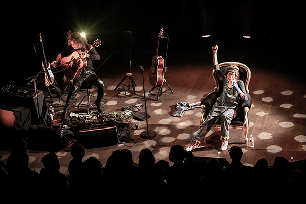 Ce printemps, la salle parisienne accueille Brigitte Fontaine à raison d’un concert par mois. Un lieu que l’on sait important pour elle, puisque c’est là qu’en 1988, elle joua après dix années loin des scènes musicales françaises. Ce choix s’explique notamment par la jauge et, comme nous le précise Caroline Teriipaia qui travaille chez son producteur Bleu Citron, « On lui avait proposé le Bataclan, mais elle a préféré une plus petite salle et plusieurs dates. » Assister à deux concerts (26 mars et 17 juin) suffit à saisir à quel point ce souhait, en favorisant l’intimité avec le public, s’accorde au plus juste avec la formule proposée. Car depuis plusieurs mois, c’est en duo avec Yan Péchin – fidèle et vénéré guitariste d’Alain Bashung, de Rachid Taha ou encore de Jacques Higelin, avec qui elle collabore depuis le début des années 2000 – que Brigitte Fontaine se produit. Cette configuration réduite est née, raconte le musicien, il y a un peu plus d’un an : « Un matin, Brigitte m’a téléphoné et m’a dit : « J’ai envie qu’on fasse un truc tous les deux ». Nous avions déjà fait une formule à trois, avec Areski, assez proche de cette forme, mais c’était pour des lectures de ses textes. »