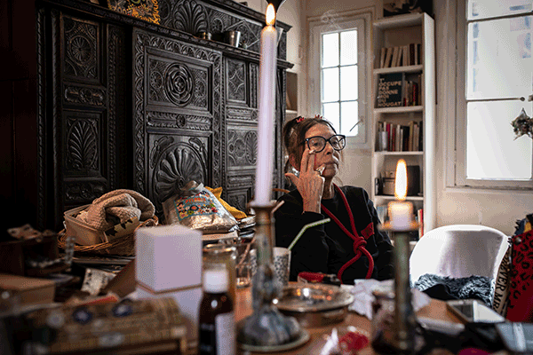 Ce tempérament imprévisible, tantôt réfléchi, tantôt spontané, toujours baroque, est celui qui ressort de la rencontre dans son appartement de l’Île Saint-Louis, où elle vit depuis quelques décennies – qu’on ne comptera pas. Dans la pièce où Brigitte Fontaine nous reçoit trône un lit clos, meuble traditionnel breton hérité de sa famille. Les étagères lourdes de livres côtoient quelques vêtements, tandis qu’une platine diffuse les Quatre chants sérieux de Johannes Brahms. D’un côté, on découvre une photographie de Serge Gainsbourg, qu’elle n’a fait que croiser et pour qui elle aurait aimé écrire ; de l’autre, une affiche de Billie Holiday – dont elle dit qu’elle est « la plus grande. De tous les pays et de tous les temps. » Tranquillement attablée, s’amusant avec une corde rouge nouée autour de sa gorge, suspendant parfois une phrase pour allumer une cigarette ou une bougie, Fontaine n’est pas de ces artistes poseurs aux mines compassées. Et, qu’elle aborde son actualité en cours et à venir, son travail d’écriture, ou encore son rapport distant au féminisme, elle fait montre d’une remarquable sincérité.