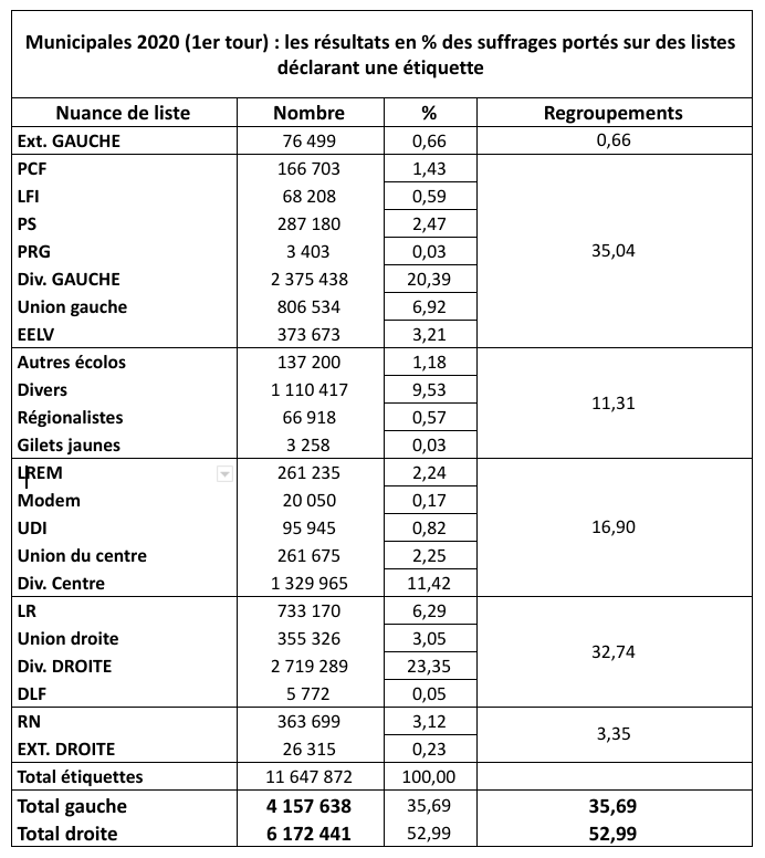 Le total des « divers centre », « divers droite » et « divers gauche » reste à 55%. Au total, la droite (incluant les 2,2% de LREM) reste majoritaire, tandis que la gauche sen tient à un peu plus d’un tiers des suffrages exprimés.