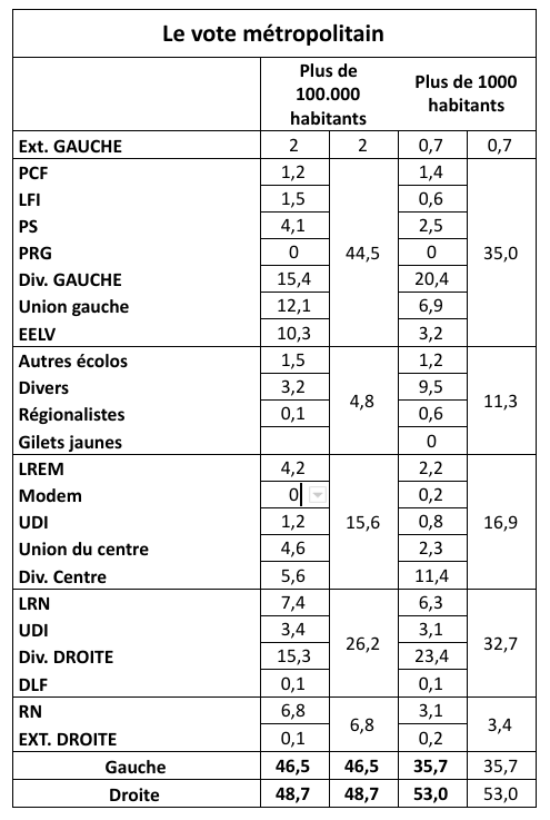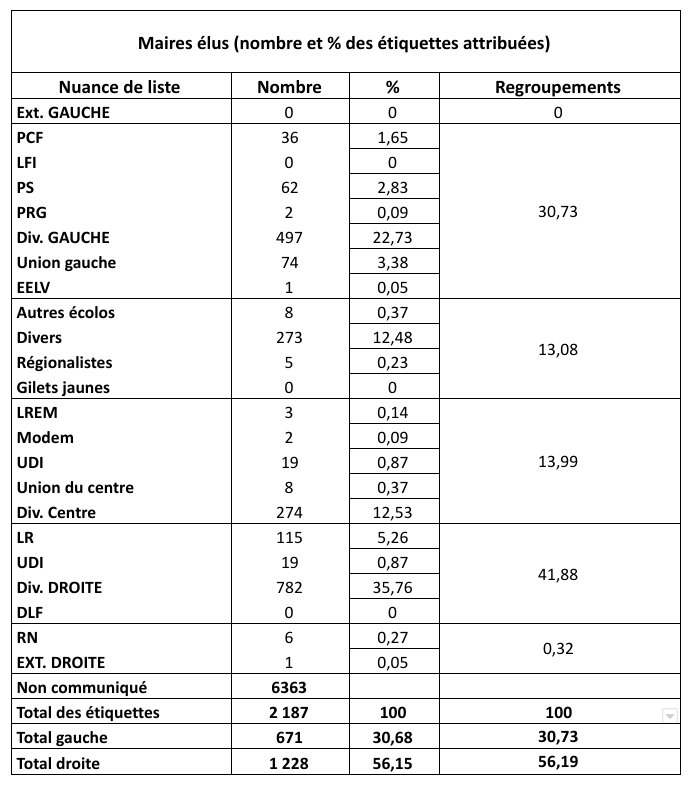 4. Les rapports des forces politiques ne sont pas faciles à décrire. En règle générale, les élections municipales sont dominées par les listes non estampillées (36,5% du total en 2014) ou enregistrées sous l’étiquette « divers droite » ou « divers gauche » (45,6% en 2014). Cette année, le phénomène a été amplifié par la décision de ne pas communiquer d’étiquette politique pour les communes de moins de 3500 habitants (31.000 communes). Les données politiques ne portent donc que sur environ 3200 communes métropolitaines. Sur ces communes, les résultats sont les suivants :