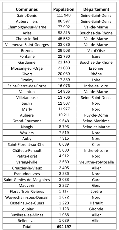 Au total, le PC conserve 232 des communes de plus de 1000 habitants qu’il gérait après 2014 (une quinzaine sont incertaines où dépourvues d’information pour l’instant). Au total, cela représente 2 millions d’habitants, auxquels s’ajoutent la population d’au moins 9 communes conquises ou reconquises. L’Île-de-France, le Nord et le massif central sont les plus touchés. Des « bastions » historiques disparaissent, Saint-Denis, Aubervilliers, Champigny, Choisy-le-Roi, mais aussi Arles, Bezons, Gardanne, Givors, Saint-Pierre-des-Corps ou Valenton.