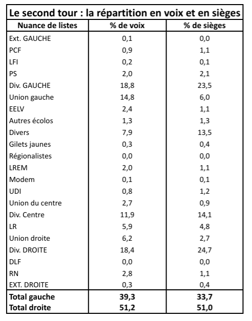 Le premier tour avait été sans appel. Dans les communes de plus de 10.000 habitants, la gauche avait fait élire 139 maires sortants (31%) et la droite 299 (68%). Au soir du second tour, dans 245 villes de plus de 30.000 habitants, la droite l’emporte dans 167 cas (68%), la gauche dans 94 cas (38%) dont 10 pour les Verts. Comme au premier tour, la distribution des votes n’est pas la même dans les grandes villes et les autres.