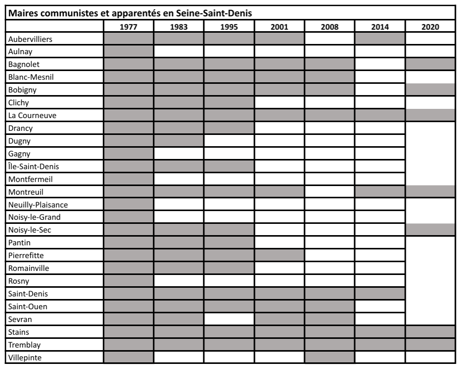 Le territoire de la Seine-Saint-Denis est particulièrement révélateur de cette évolution. Le département a compté en 1977 jusqu’à 27 municipalités communistes sur 40, regroupant 80% de la population départementale. En trente ans, 20 d’entre elles ont été perdues et celles qui restent ne rassemblent plus qu’un cinquième de la population du « 9-3 ».