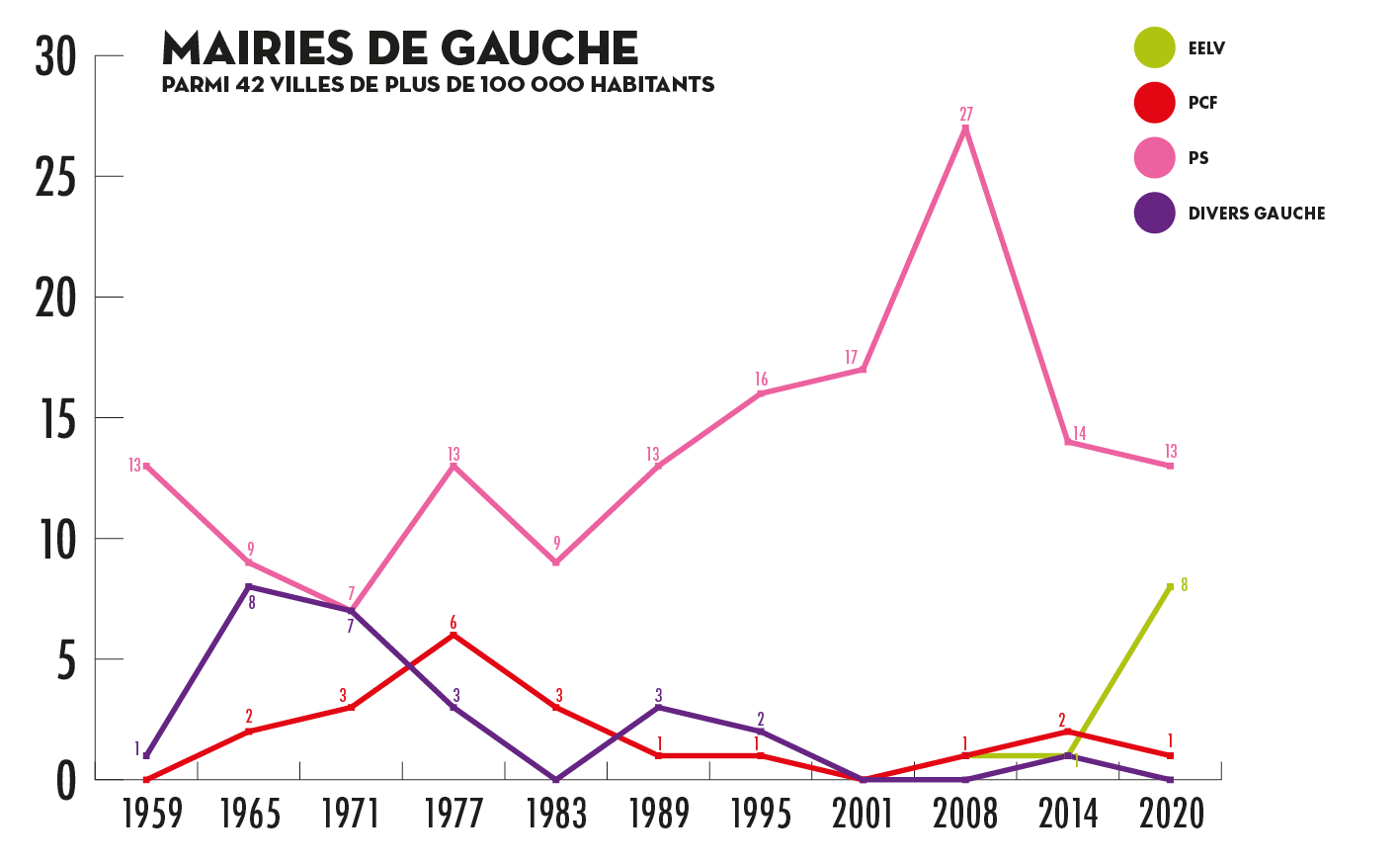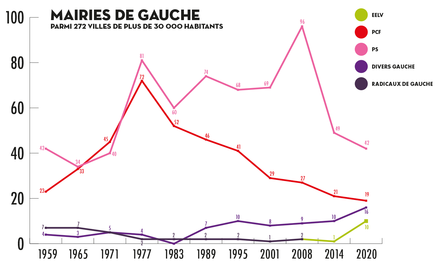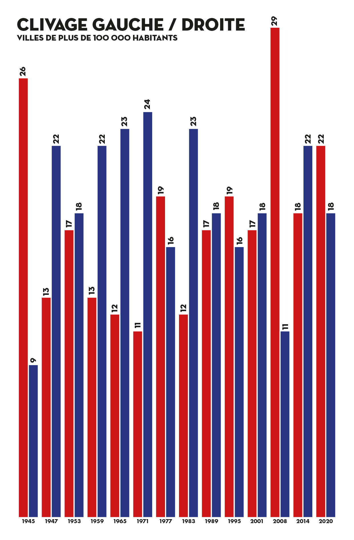 D’aucuns estiment qu’il n’est plus, mais force est de constater qu’aux élections municipales, le clivage gauche-droite est toujours un indicateur éloquent. De même que pour les municipalités de gauche, nous avons pris pour référence les villes de plus de 30.000 habitants et celles de plus de 100.000 habitants.