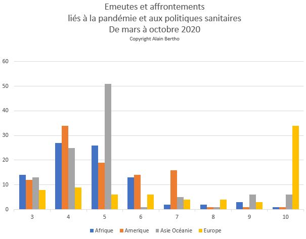 L’arrivée de la pandémie en 2020 n’a pas mis longtemps un couvercle sur ce monde. Dès avril, de nouveaux affrontements ont lieu en Irak les 21 et 26, de nouvelles manifestations sont dispersées à Hong Kong le 28, de nouvelles barricades apparaissent à Santiago, Iquique et Penalolen les 24, 26 et 27. Surtout, au Liban touché par une crise monétaire et donc sociale, les émeutes avec attaques de banques éclatent à Beyrouth, Tyr, Tripoli, Saïda les 23, puis 27-28-29. La mobilisation chilienne est ses rendez-vous hebdomadaires ne s’est pas démentie depuis, notamment contre la diminution des pensions de retraites pour financer les dépenses de santé. La révolte libanaise a pris une ampleur sans précédent après l’explosion de 2750 tonnes de nitrate d’ammonium sur le port de Beyrouth le 4 août 2020. Même le gouvernement Netanyahu doit faire face à une contestation brutale dans la rue dès le mois de juillet. En octobre, le Nigeria connaît un véritable soulèvement contre les violences policières et la corruption du pouvoir, accompagné de pillages massifs des réserves gouvernementales de vivres.
