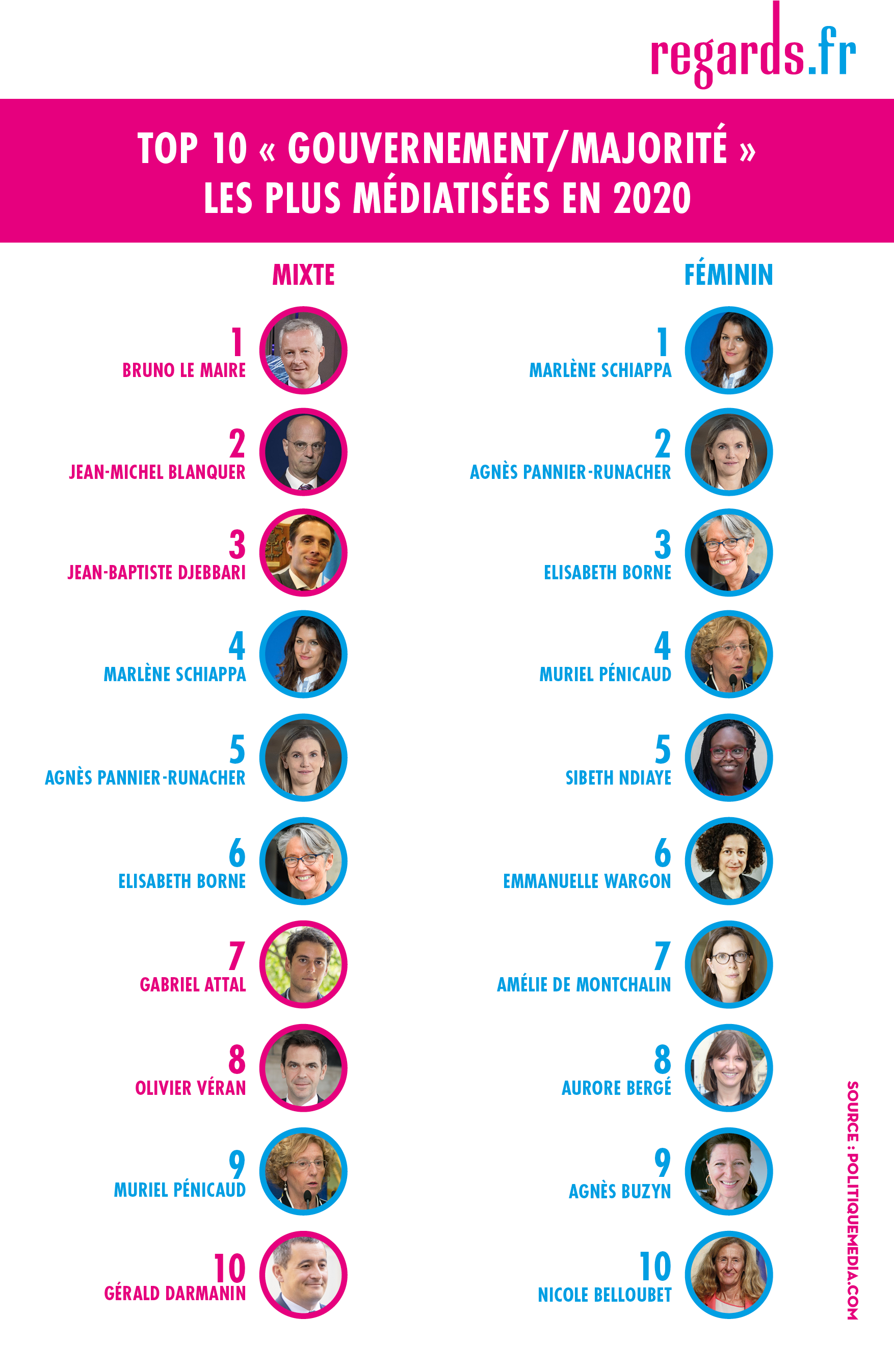 Analyse Regards : il est intéressant de noter que pour une année de crise sanitaire, le ministre de la Santé – même si l’on additionne les chiffres de Buzyn et Véran – est loin d’être surmédiatisé. Ce sont les ministères liés à l’économie et celui de l’Éducation qui ont été les plus invités par les médias. Quant à la place de Marlène Schiappa – qui fut en 2020, rappelons-le, secrétaire d’État chargée de l’Égalité entre les femmes et les hommes et de la Lutte contre les discriminations avant de passer, sous Castex, ministre déléguée auprès du ministre de l’Intérieur, chargée de la Citoyenneté –, elle est pour le moins étonnante. À croire que la fonction ne fait pas toujours l’aura médiatique.