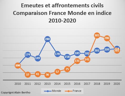 À reprendre continent après continent la carte des colères du monde, on en vient à penser que la France y tient une place presque emblématique de l’époque. Aucune facette ne manque. En fait, si le pays s’inscrit dans le trend décennal des violences civiles, le nombre d’événements a doublé en 10 ans avec une accélération nette en 2017 , année de l’élection présidentielle. La courbe comparative en indice le montre avec évidence. Les « années Macron » ont été celles d’une aggravation brutale de la longue crise démocratique.