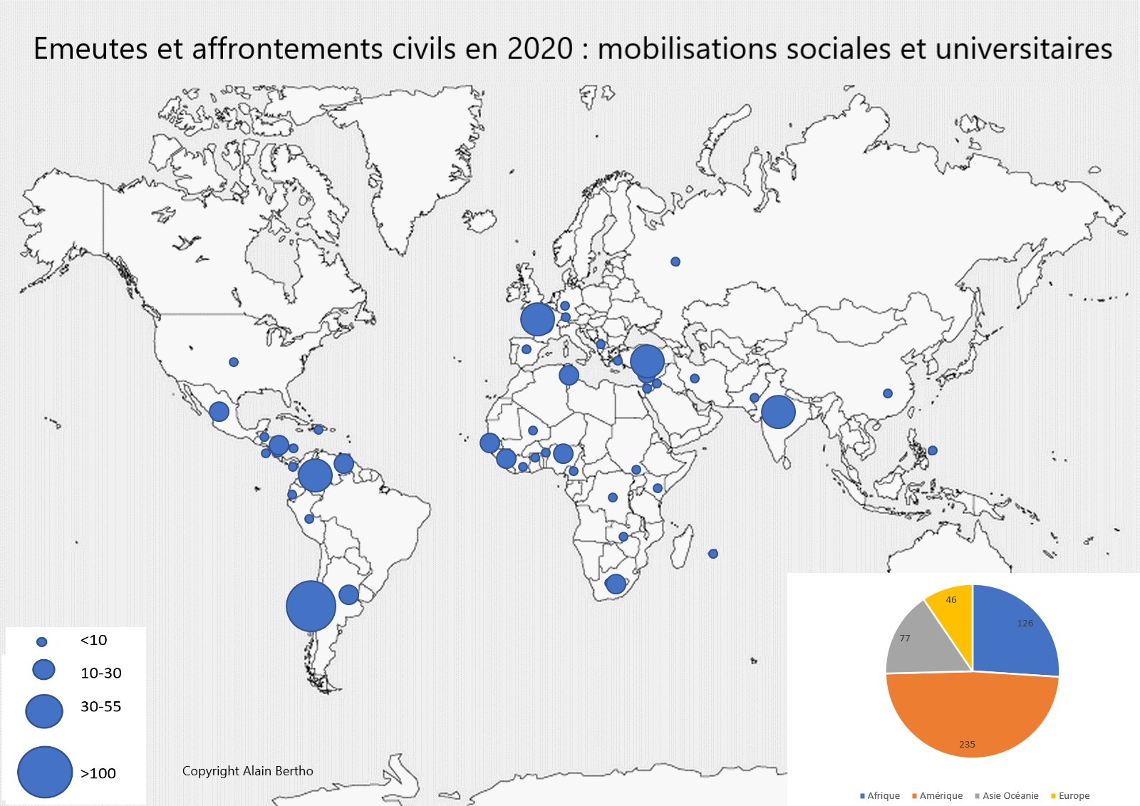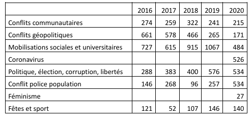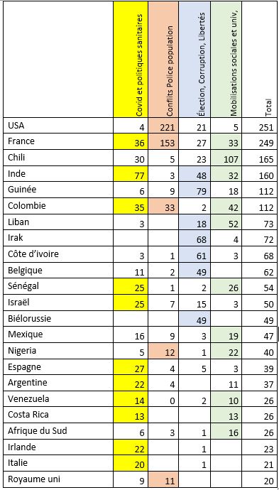 Un cinquième des affrontements concerne les politiques sanitaires et un cinquième les mobilisations contre la police et les violences policières. Inversement, les mobilisations sociales et universitaires qui étaient devenues majoritaires depuis deux ans passent en quatrième position. Si on ajoute les émeutes et affrontements liés aux élections, à la corruption des États où aux attaques contre les libertés, en 2020, plus de 60% des situations d’affrontement sont générées par une remise en cause fondamentale de l’autorité publique, de sa légitimité et de sa police.