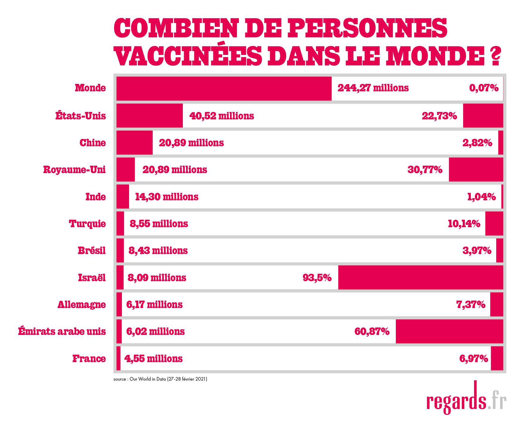 En proportion de vaccins administrés, selon les chiffres de COVID-19 Vaccine Tracker en date du 2 mars, la France pointe à la 25ème place européenne, à 63,7% (6.451.055 doses reçues et 4.111.791 doses utilisées). L’Allemagne, avec 67,8% de doses utilisées, est 21ème. À ce jour, la France possède donc un stock de 2.339.264 doses de vaccin, 2.722.346 pour nos voisins Allemands.