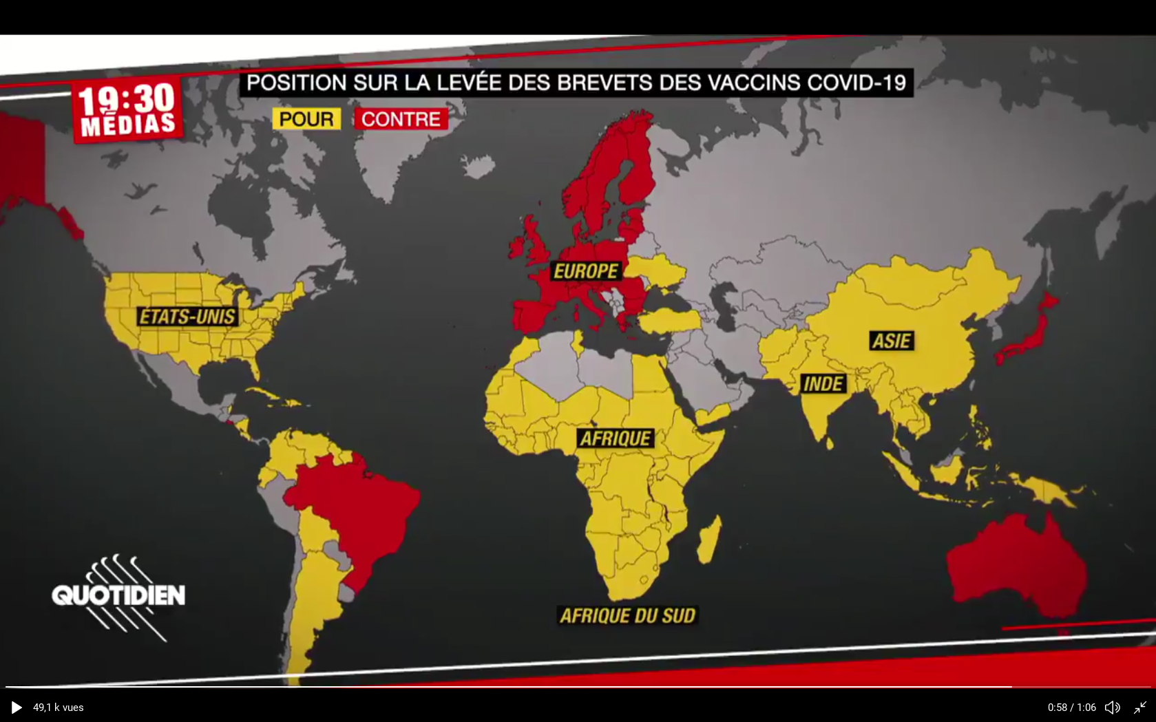 Il va sans dire que les patrons des laboratoires qui produisent et vendent actuellement des vaccins sont contre – n’oublions pas qu’ils sont tous riches à ne plus que savoir en faire aujourd’hui et qu’ils n’auraient pas pu commencer à pouvoir imaginer l’être sans l’argent public français et américain… Mais qui est-ce qui bloque ? Entre autres, la France. À chaque fois qu’elle doit voter, elle vote contre la levée des brevets. D’ailleurs, c’était la ligne officielle du gouvernement. Voyez ces déclarations :