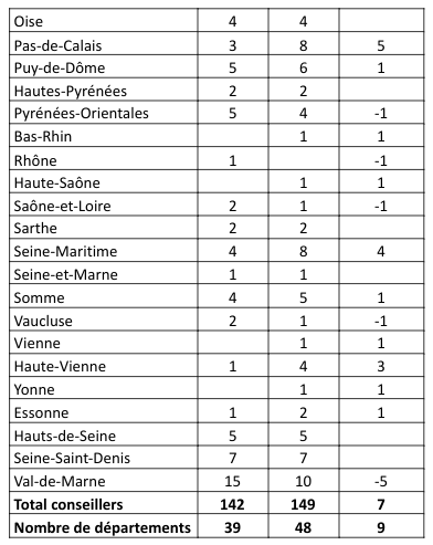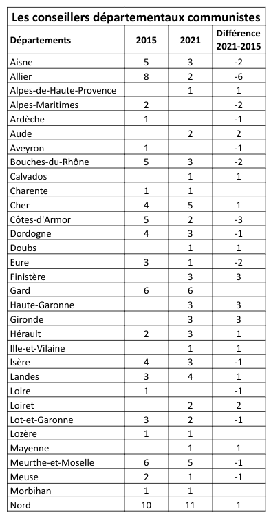 Le score des conseillers confirme en l’amplifiant l’image dressée les jours suivants l’élection. En 2015, 142 conseillers départementaux avaient été élus sous l’étiquette communiste (auxquels s’ajoutaient une douzaine d’apparentés). En 2021, ce sont 149 conseillers qui sont élus sous la même étiquette. Le PCF entre dans 14 départements où il n’avait pas de conseillers et n’est exclu que de 5 autres, soit un gain global de 9 départements : 39 en 2015, 48 en 2021.