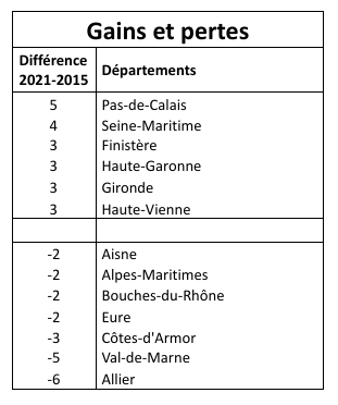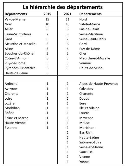 La fourchette s’est resserrée (de 1 à 15 en 2015, de 1 à 11 en 2021). Le Nord ravit la première place au Val-de-Marne et le Pas-de-Calais vient s’insérer dans le trio de tête. Les Hauts-de-France se taillent la part du lion et la Seine-Maritime s’adosse à l’ensemble septentrional.