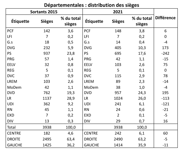 Le RN et les partisans du Président se contentent des miettes, même si le centre se conforte légèrement entre 2015 et 2021. Quant au RN, il diminue par deux son maigre capital précédent. On notera toutefois que, si la mouvance des socialistes et des Républicains se porte bien, ce sont les « divers droite » et « divers gauche » qui bénéficient des mouvements internes aux deux camps. Comme si LR et PS devaient mettre de côté leur étiquette pour maintenir leurs positions respectives.