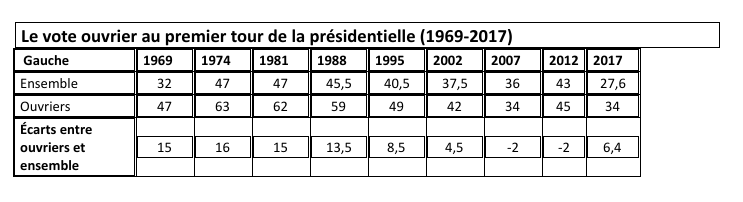 1. Un constat est sans appel : le monde ouvrier ne se reconnaît plus dans la gauche. Beaucoup d’ouvriers avaient utilisé le vote socialiste ou communiste pour se défendre, affirmer leur dignité et envisager un avenir meilleur. Ces votes ont perdu en même temps leur utilité et leur sens. En avril 2017, entre 70% et 75% des ouvriers ont voté à la présidentielle ; sur ce nombre, un tiers à peine a voté à gauche et plus de 40% à l’extrême droite.