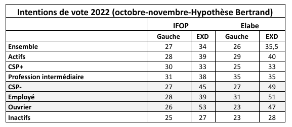 Le mouvement s’est poursuivi et s’est même amplifié après 2017, et les sondages ne laissent pas entrevoir de retournement de tendance. Selon les indicateurs les plus récents, les catégories populaires qui indiquent un vote n’iraient pas plus que la moyenne vers la gauche (un peu plus du quart) et se porteraient pour moitié vers l’extrême droite.