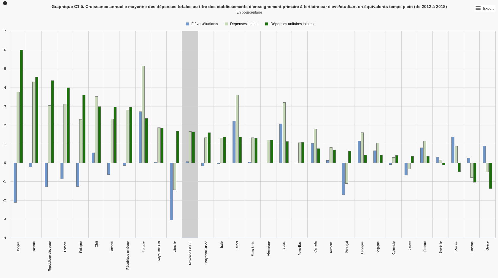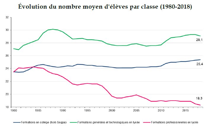 De 2012 à 2018, en France, la dépense par élève du primaire à la fin du second degré a augmenté de 0,5% par an. Soit trois fois moins que la moyenne de l’OCDE (1,6%) ou que la moyenne européenne (1,4%). En Allemagne, la dépense d’éducation augmente deux fois plus vite (0,9%), au Royaume-Uni et aux États-Unis trois fois (1,3%), en Italie quatre fois plus vite. Si l’on inclut le supérieur, l’écart est encore plus important entre la France (0,3%) et l’OCDE (1,6%)[[Café pédagogique et OCDE.]].