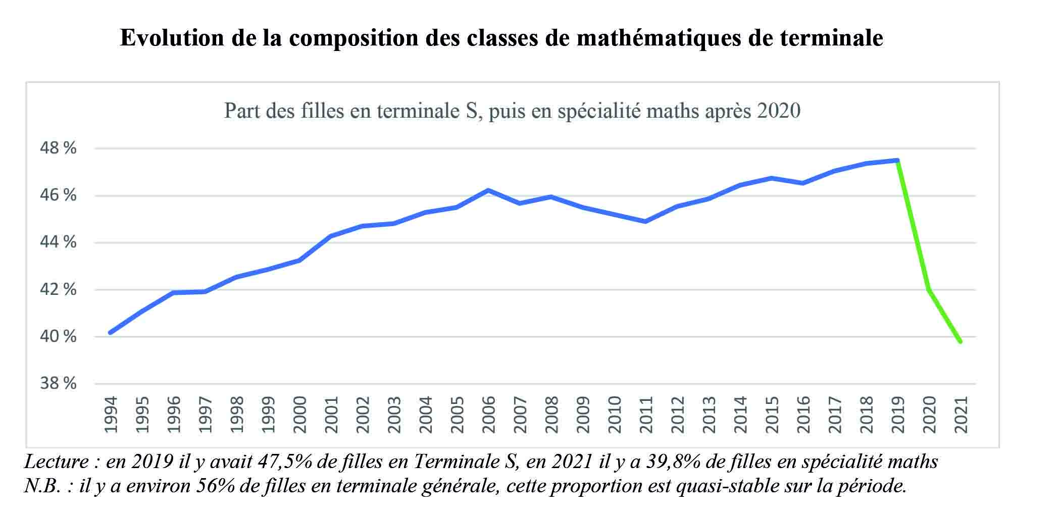 La réforme Blanquer du lycée a immédiatement aggravé les choses, notamment en réduisant massivement l’enseignement de mathématiques au lycée. Elle entraîne 25 ans de recul sur les inégalités filles/garçons[[Communiqué des sociétés savantes et associations de mathématiques, ADIREM, APMEP, ARDM, CFEM, Femmes et Mathématiques, SFdS, SMAI, SMF, UPS (25 janvier 2022).]].