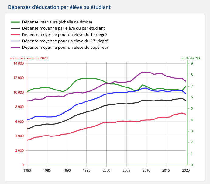 Si l’effort était resté le même, il y aurait 23 milliards de dépenses publiques d’éducation en plus – la hausse de 0,3 point en 2020 est due à la chute de 8% du PIB.