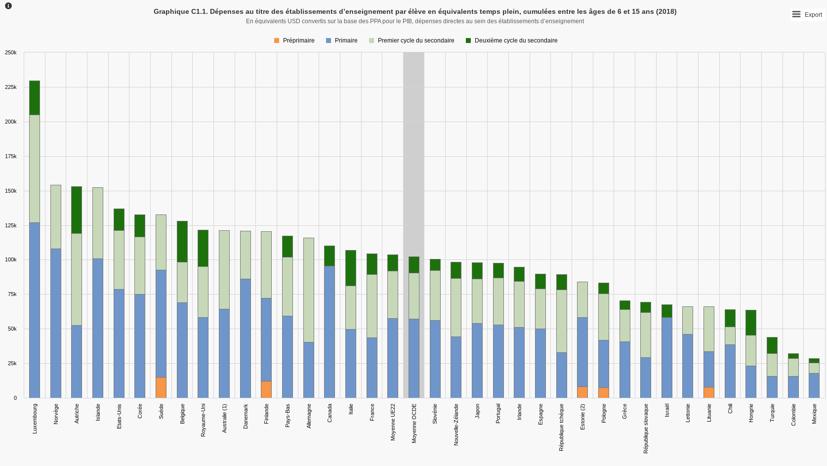 La part de la jeunesse dans sa population est plus élevée. Pour mesurer et comparer l’effort de chaque pays consacré à l’éducation, il faudrait prendre non pas seulement le volume des dépenses publiques par rapport au PIB mais les dépenses publiques par élève. Cette comparaison n’existe pas. L’OCDE intègre toutes les dépenses d’éducation publiques et privées. En France la dépense totale d’éducation est de 6,6% du PIB, dont 55% est financé par l’État et 23% par les collectivités locales. 11% est payé par les ménages et 9% par les entreprises.