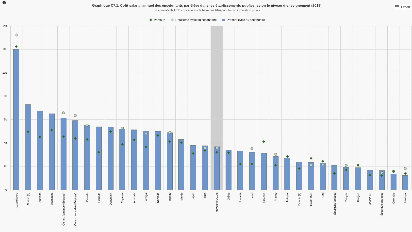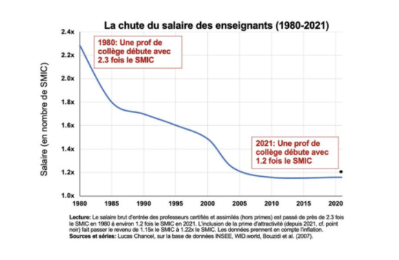 Au total : salaires comparativement bas + classes chargées + temps de travail plus long = un coût salarial annuel des enseignants par élève parmi les plus bas de l’OCDE + une perte de moral et une perte d’attractivité du métier d’enseignant[[OCDE « Regards sur l’éducation 2021 » ; Annexe du rapport du Sénat sur le projet de loi de Finances pour 2022 portant sur l’enseignement scolaire.]]