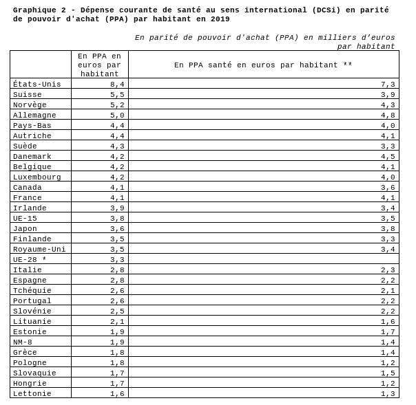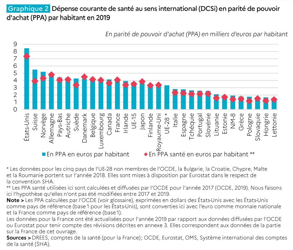 Surtout, si l’on tient compte de la population et du niveau de vie, la France n’est plus en tête du peloton. La dépense de santé en parité de pouvoir d’achat par habitant s’élève à 4067 euros en 2019 soit deux fois moins qu’aux USA. Elle est au 8ème rang des pays d’Europe et au 12ème des pays de l’OCDE.