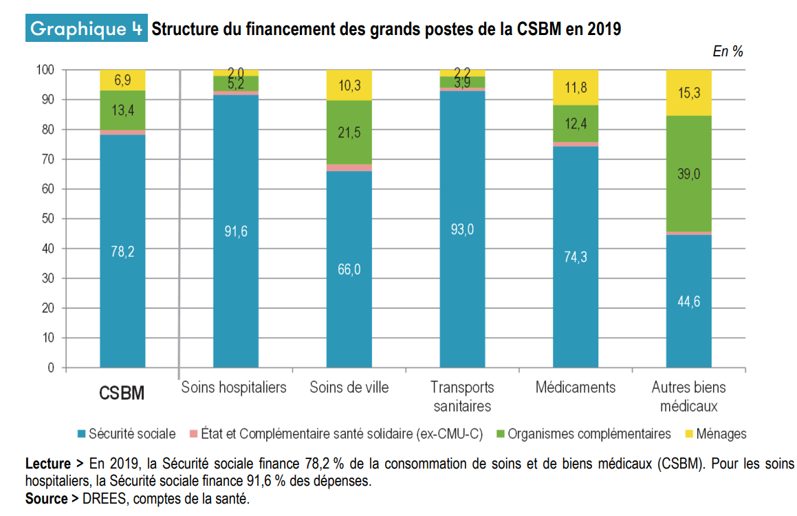 En France, la conquête de la Sécurité sociale et la généralisation de l’assurance maladie obligatoire cohabite avec le rôle maintenu des organisations mutualistes et des assurances privées (13,5% en moyenne des dépenses totales). Le reste à charge pour les ménages est en moyenne de 7%. Les hôpitaux publics occupent une place centrale dans le système des soins, et la production des soins en ville est dominée par la médecine libérale et la tarification à l’acte. La prévention et la politique de santé publique sont les parents pauvres du système.