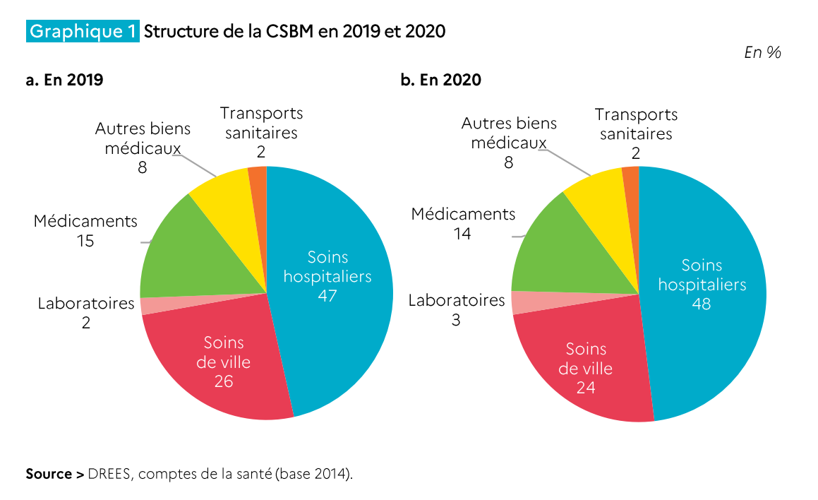 En 2019, les dépenses de santé en France, selon la définition internationale de la dépense courante de santé (comprenant la consommation de soins et de biens médicaux, les dépenses de prévention les dépenses liées à la gouvernance du système de santé, et y compris les revenus de remplacement et les dépenses liées à l’invalidité et au handicap) s’élevaient à 270 milliards d’euros, représentaient 11,1% du produit intérieur brut (PIB). Cela place la France nettement en dessous des États-Unis (17% du PIB) ; un peu en dessous de l’Allemagne (11,7%) et de la Suisse (11,3%) ; et un peu au-dessus de la Suède, du Japon, du Canada, de la Belgique, de la Norvège et des Pays-Bas (tous au-dessus de 10%).
