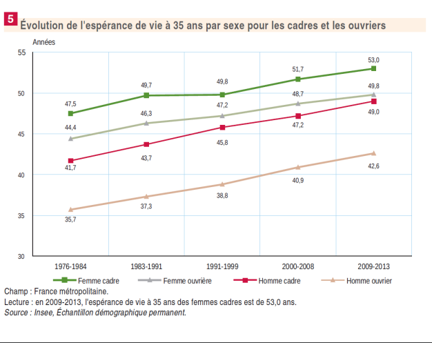 L’espérance de vie à 35 ans des cadres est supérieure à celles des ouvriers et l’écart est stable depuis les années 1970 : Proche de 3 ans d’écart pour les femmes. Proche de 6,5 ans d’écart pour les hommes. Compte tenu d’une forte inégalité d’espérance de vie entre femmes et hommes (5,8 ans en 2019 quasi stable depuis 1950), l’espérance de vie des femmes ouvrières est supérieure à celle des hommes cadres. L’écart entre les cadres et les ouvriers est stable depuis les années 1970.