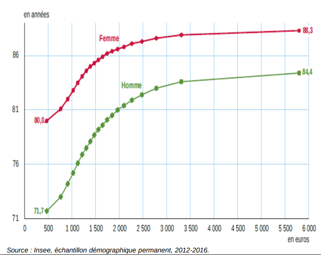 Plus on est riche, plus l’espérance de vie est élevée : 8,3 ans d’écart pour les femmes ; 12,7 ans d’écart pour les hommes.