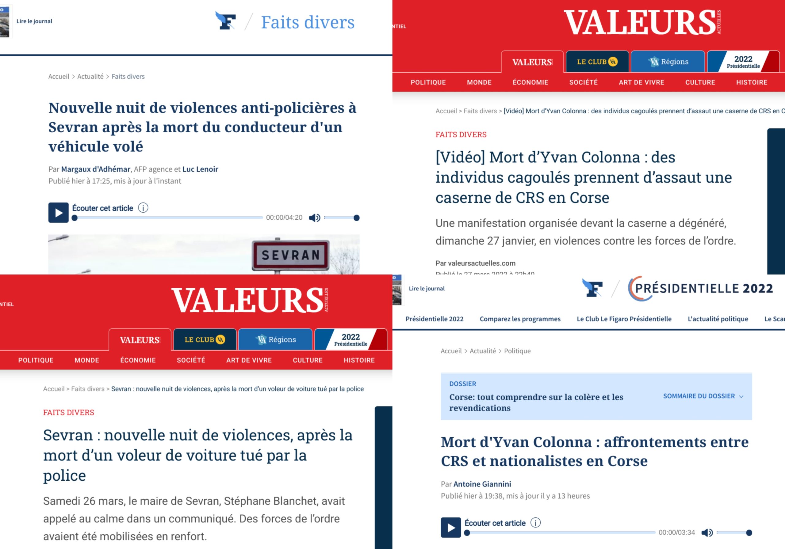 Une double vision du monde qui se laisse voir dans la couverture médiatique des deux événements. Nous avons pris deux journaux de droite – Le Figaro et Valeurs actuelles – pour bien saisir à quel point le vocabulaire et les tournures de phrases en disent long[[« Nouvelle nuit de violences anti-policières à Sevran après la mort du conducteur d’un véhicule volé » (rubrique Faits divers) et « Mort d’Yvan Colonna : affrontements entre CRS et nationalistes en Corse » (rubrique Politique), publié çà et là le 27 mars sur lefigaro.fr ; « [Vidéo] Mort d’Yvan Colonna : des individus cagoulés prennent d’assaut une caserne de CRS en Corse » et « Sevran : nouvelle nuit de violences, après la mort d’un voleur de voiture tué par la police », publié le 27 et 28 mars sur valeursactuelles.com]].