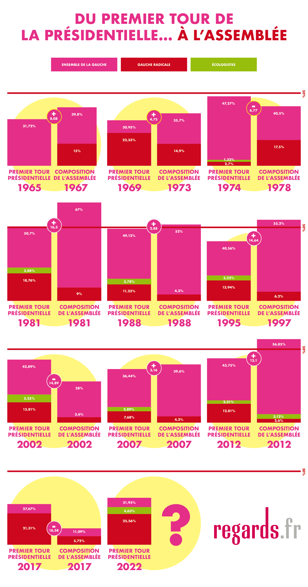 L’infographie présentée ci-dessous permet de visualiser les écarts entre le niveau présidentiel de la gauche et sa place dans les assemblées élues après chaque élection présidentielle.