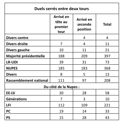 Le profil des binômes en lice (il n’y a eu que huit triangulaires) laissait entendre que la bataille serait d’abord entre les deux forces arrivées nationalement en tête : Ensemble et la Nupes étaient présents respectivement dans 397 et 368 circonscriptions métropolitaines. Mais, avec ses 221 candidatures, le RN restait en embuscade. Ajoutons que, dans 180 des circonscriptions en jeu, l’écart entre les deux premiers était inférieur à 2%. Autant dire que tout semblait ouvert et, de fait, on peut noter que, dans plus de 60 circonscriptions, l’écart au second tour est resté inférieur à 2%, ce qui correspond souvent à une poignée infime de voix séparant vainqueurs et vaincus.