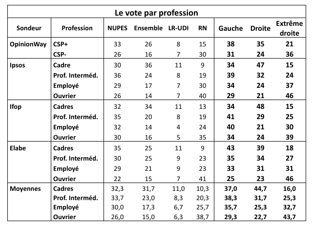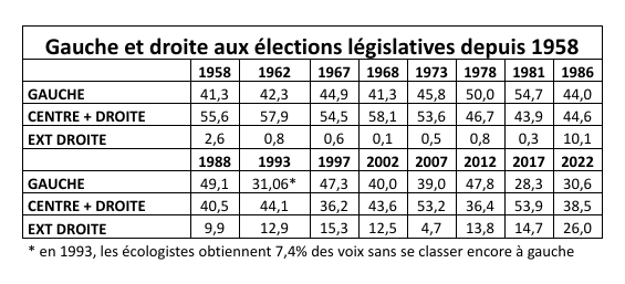 Si l’on s’en tient au pourcentage d’exprimés, la droite obtient son troisième plus mauvais score depuis 1958, la gauche son deuxième plus mauvais score, tandis que l’extrême droite pulvérise son record législatif de 1997. L’installation de cette extrême droite bouleverse la donne. Jusqu’en 1986, tout se jouait entre deux blocs plus ou moins homogènes : une gauche partagée pour l’essentiel entre le PC et le PS et une constellation variable de la droite et du centre. La balance entre droite et gauche jouait en faveur de la droite jusqu’en 1973, puis alternativement en faveur de l’un des deux camps jusqu’en 2017. Bon an mal an, le clivage fondateur structurait le champ politique avec, au cœur de chaque grande famille, un parti dominant, pivot des majorités et des gouvernements. Peu à peu cette simplicité s’est érodée. La gauche et la droite restent certes des repères et ordonnent encore massivement les choix des individus. Mais la confiance s’est altérée dans chaque camp et d’autres lignes de clivage sont venues perturber les représentations dans les deux grands blocs historiques. L’abstention massive s’est faite structurelle, le vote est devenu aléatoire et l’engagement civique est de plus en plus incertain. Les chefs de file ont perdu de leur superbe, les héritiers plus ou moins lointains du gaullisme historique, comme ceux du socialisme post-congrès d’Épinay. En 2017, la débâcle du social-libéralisme de gouvernement ouvre la voie à une recomposition macronienne qui se veut « et à gauche et à droite ». Du coup la gauche obtient le plus mauvais résultat global de son histoire législative et, pour la première fois depuis la fin des années 1970, c’est la gauche la plus à gauche qui donne le ton. Mais, à l’autre extrémité du spectre politique, l’extrême droite redéployée s’installe chaque jour un peu plus, imposant l’idée qu’elle est une forme plus radicale de la droite et non le rejeton dangereux des extrêmes droites fascisantes du passé.