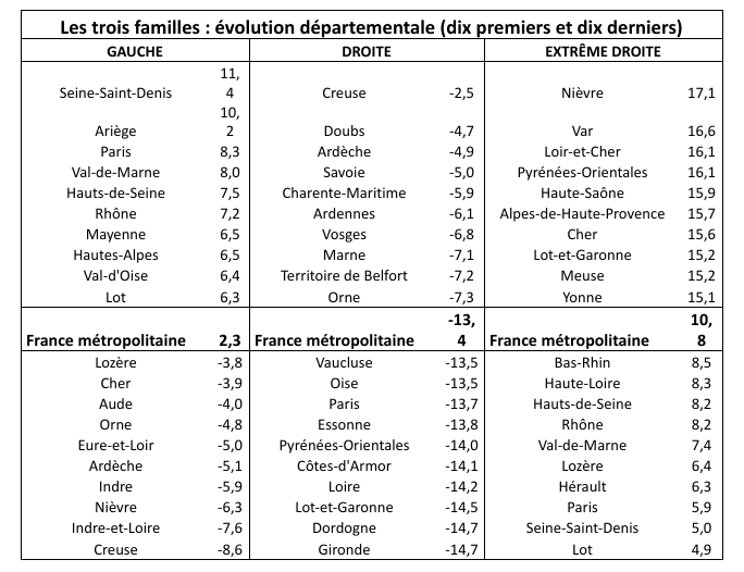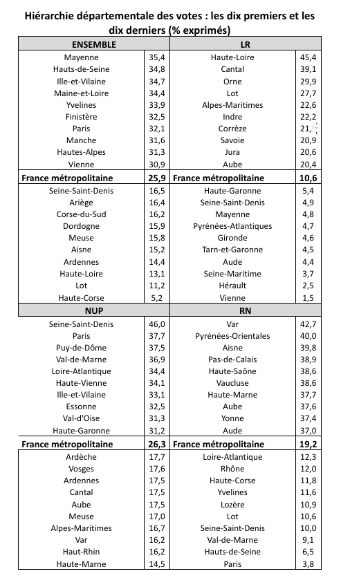 Le tableau des données législatives nous donne une indication de l’équilibre : la gauche redépasse légèrement le seuil perdu des 30% ; le total des droites classiques, épuisé par cinq ans de macronisme, abandonne la majorité confortable de 2017 pour passer au-dessous du seuil de 40% ; quant à l’extrême droite, elle oscille entre le tiers des suffrages présidentiels et un score législatif en progrès de plus de 11 points sur 2017.Au premier tour de la présidentielle de 2017, l’irruption du phénomène Macron mettait en scène la concurrence de quatre forces d’importance proche : une droite classique (François Fillon), une extrême droite relookée (Marine Le Pen), une gauche réorientée vers sa gauche (Jean-Luc Mélenchon) et un ovni (Emmanuel Macron) qui voulait théoriquement s’abreuver à la fois du côté de la droite et de celui de la gauche. En cinq ans, Macron a déstabilisé un peu plus une partie de la gauche (le compteur s’est fixé sur les chiffres de 2017 jusqu’à il y a quelques mois). La gauche attirée par Macron n’est pas revenue vers la gauche, une partie de la droite s’est laissé séduire par le parti pris modernisateur du nouveau Jupiter et une autre partie de cette droite a trouvé plus de mordant du côté du Rassemblement national. Nous voilà du coup, non pas devant quatre familles mais devant trois. Le tableau des données législatives nous donne une indication de l’équilibre : la gauche redépasse légèrement le seuil perdu des 30% ; le total des droites classiques, épuisé par cinq ans de macronisme, abandonne la majorité confortable de 2017 pour passer au-dessous du seuil de 40% ; quant à l’extrême droite, elle oscille entre le tiers des suffrages présidentiels et un score législatif en progrès de plus de 11 points sur 2017. Il y avait autrefois une France de gauche et une France de droite. Il y a désormais des France qui tendent à se cloisonner. Les « familles » ont leurs territoires de prédilection. Beaucoup a été dit et commenté, de façon souvent passionnante, sur les territoires contrastés de la politique. On ne les répétera pas ici. Seules seront mises en exergue quelques données simples. La première est un tableau illustrant la hiérarchie départementale des votes de quatre acteurs politiques au premier tour de la récente élection législative.