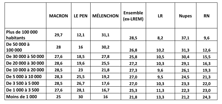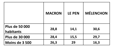 À la présidentielle, le vote en faveur de Marine Le Pen augmente au fur et à mesure que diminue la taille de la commune ; en sens inverse, celui de Jean-Luc Mélenchon diminue en même temps que la taille de la commune. La candidate du Rassemblement national est marginalisée dans les grandes métropoles et largement dominée par ses deux concurrents (Macron et Mélenchon) dans les communes de plus de 30.000 habitants ; en revanche, elle surclasse Mélenchon et domine Macron, dans les unités de moins de 5000 habitants (qui regroupent 38% de la population française). Macron et Mélenchon se disputent les métropoles (avec un avantage à Mélenchon) ; Le Pen s’attribue la tranche des tailles inférieures, où s’est retrouvée une population de catégories modestes exclues de l’espace métropolitain par la désindustrialisation et par la crise urbaine.