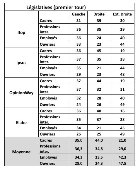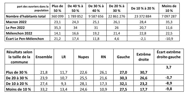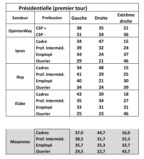 Dans tous les cas, les résultats sont sans appel : parmi les individus qui ont voté à la présidentielle et aux législatives, le pourcentage de l’extrême droite augmente au fur et à mesure que l’on descend dans l’échelle sociale, tandis que celui de la droite (avant tout macronienne) baisse de façon tout aussi régulière. Quant à la gauche (avant tout Mélenchon puis la Nupes) elle est au-dessus de 35% du côté des professons intermédiaires, des employés et des cadres et au-dessous de 30% chez les ouvriers. Dans les milieux ouvriers, l’écart entre la gauche et l’extrême droite est entre 14% et près de 20%, plus accentué encore aux législatives qu’à la présidentielle.