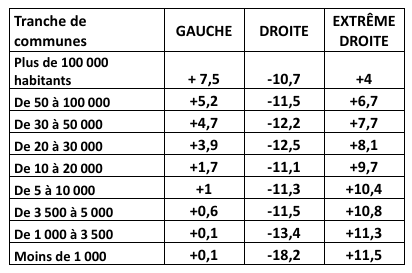La progression de la gauche est d’autant plus forte que la taille de la commune est importante ; elle est inférieure à 1% dans les communes de moins de 5000 habitants. L’extrême droite, en revanche, augmente sensiblement dans tous les niveaux de communes ; mais sa croissance est d’autant plus grande que diminue la taille de la commune.