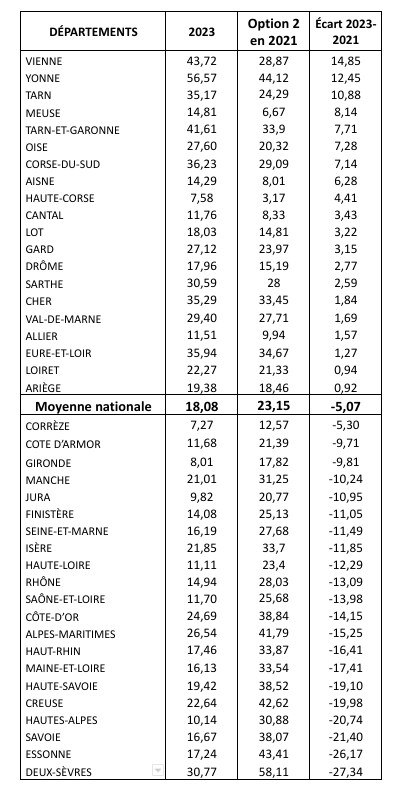 En réalité, les rapports des forces révélés par le vote du week-end ne font que refléter celui qui s’était exprimé en 2021, quand il s’était agi de définir la stratégie communiste pour l’élection présidentielle à venir. En mai de cette année-là, les militants communistes avaient été appelés à choisir entre deux options, l’une qui proposait une candidature communiste, l’autre qui suggérait de pousser le plus loin possible les démarches en vue d’un rassemblement à gauche. Près des trois quarts des militants consultés avaient alors choisi la première option, et un peu plus de 23% avaient retenu la seconde. Dans l’ensemble, les résultats d’Urgence de communisme en 2023 se rapprochent de ceux d’avril 2021, mais avec un tassement de 5% entre les deux dates. La progression en pourcentage de la sensibilité « unitaire » s’observe dans 24 départements, mais le fléchissement l’emporte, parfois de façon spectaculaire, dans 72 autres. Le tableau ci-après présente l’évolution dans les vingt départements où la progression est la plus forte et dans les vingt où le recul est le plus sensible.