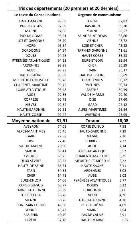 La distribution des votes reflète pour une large part celle des signataires des textes en lice. Le texte majoritaire est au-dessus de sa moyenne nationale dans 60 départements et n’est au-dessous du tiers des exprimés que dans 12 départements. Il dépasse au contraire les 90% dans 28 d’entre eux : ses zones de force se situent avant tout dans le Nord et l’Est, ainsi que dans le Massif central et le quart sud-ouest. Les résultats du texte minoritaire sont sensiblement au-dessous des prévisions les plus basses de ses partisans. Ses zones les plus favorables sont en nombre restreint : il ne dépasse la moyenne nationale que dans 36 départements et il n’est majoritaire que dans 4 d’entre eux, dont le plus important est la Seine-Saint-Denis. La moitié des voix obtenues (5300) sont concentrées dans 11 départements (Seine-Saint-Denis, Val-de-Marne, Hauts-de-Seine, Bouches-du-Rhône, Paris, Gard, Seine-Maritime, Hérault, Alpes-Maritimes, Essonne) dont 5 en région parisienne.