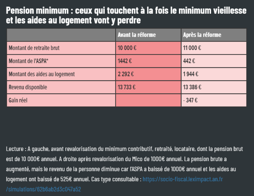 Non seulement la revalorisation des minima de pensions ne permettra d’atteindre les 1200 euros qu’à un petit nombre de personnes mais, en plus, il n’y aura même pas que des très petits gagnants. C’est ce que démontre à nouveau Michaël Zemmour dans son blog d’Alternatives économiques. Ceux qui perçoivent à la fois une pension retraite minimum et du minimum vieillesse ne gagneront rien. Ceux qui perçoivent en plus de leur pension minimum des aides au logement verront leur augmentation rognée. Et ceux qui perçoivent minimum retraite, minimum vieillesse et aide au logement y perdront.
