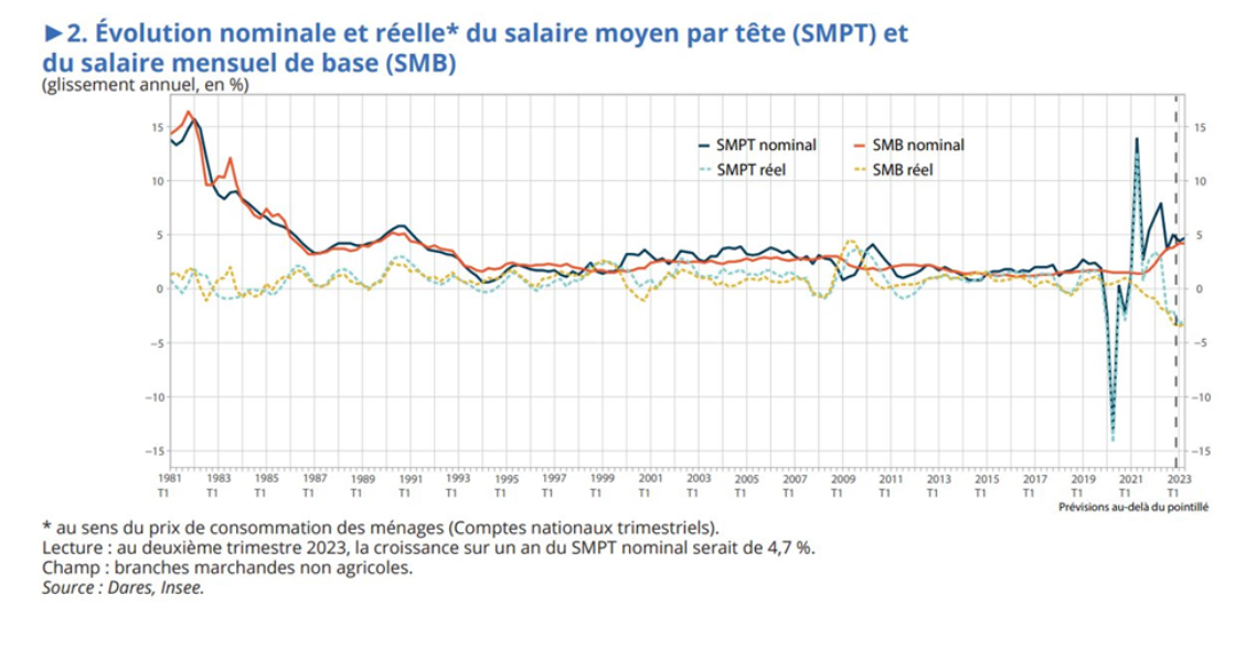 Concernant les salaires, le constat du très officiel INSEE est sans appel : en 2022, la baisse du pouvoir d’achat des salaires a été de 1,8%. Elle est « inédite depuis le début des années 1980 ». Et en 2023 cela va continuer.