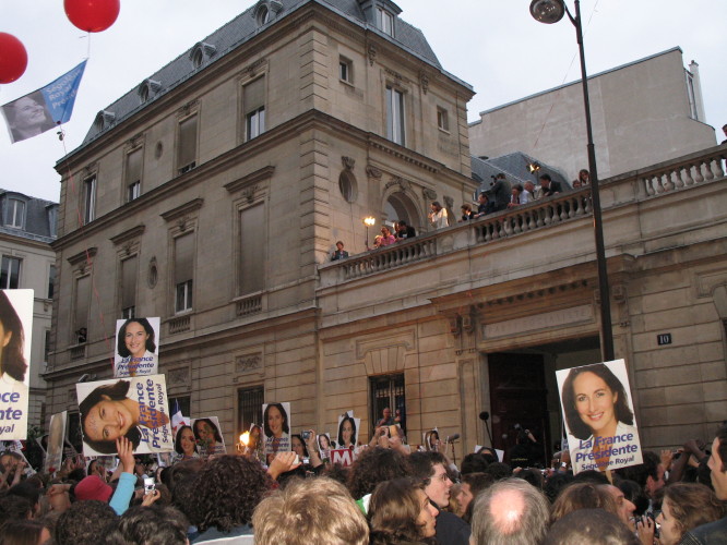 C’est pourtant bien parti. Ils y croient. La victoire ne peut pas leur échapper. Forêt d’affiches électorales, cornes de brume, concert d’applaudissements. Tous les ingrédients sont réunis pour exulter de joie à 20 heures. Massés devant le QG de campagne de Ségolène Royal, les militants socialistes et apparentés s’époumonent des heures durant pour encourager leur championne. Une rose rouge d’une main, une pancarte « Ségolène présidente ! » de l’autre dans une ambiance bon enfant.